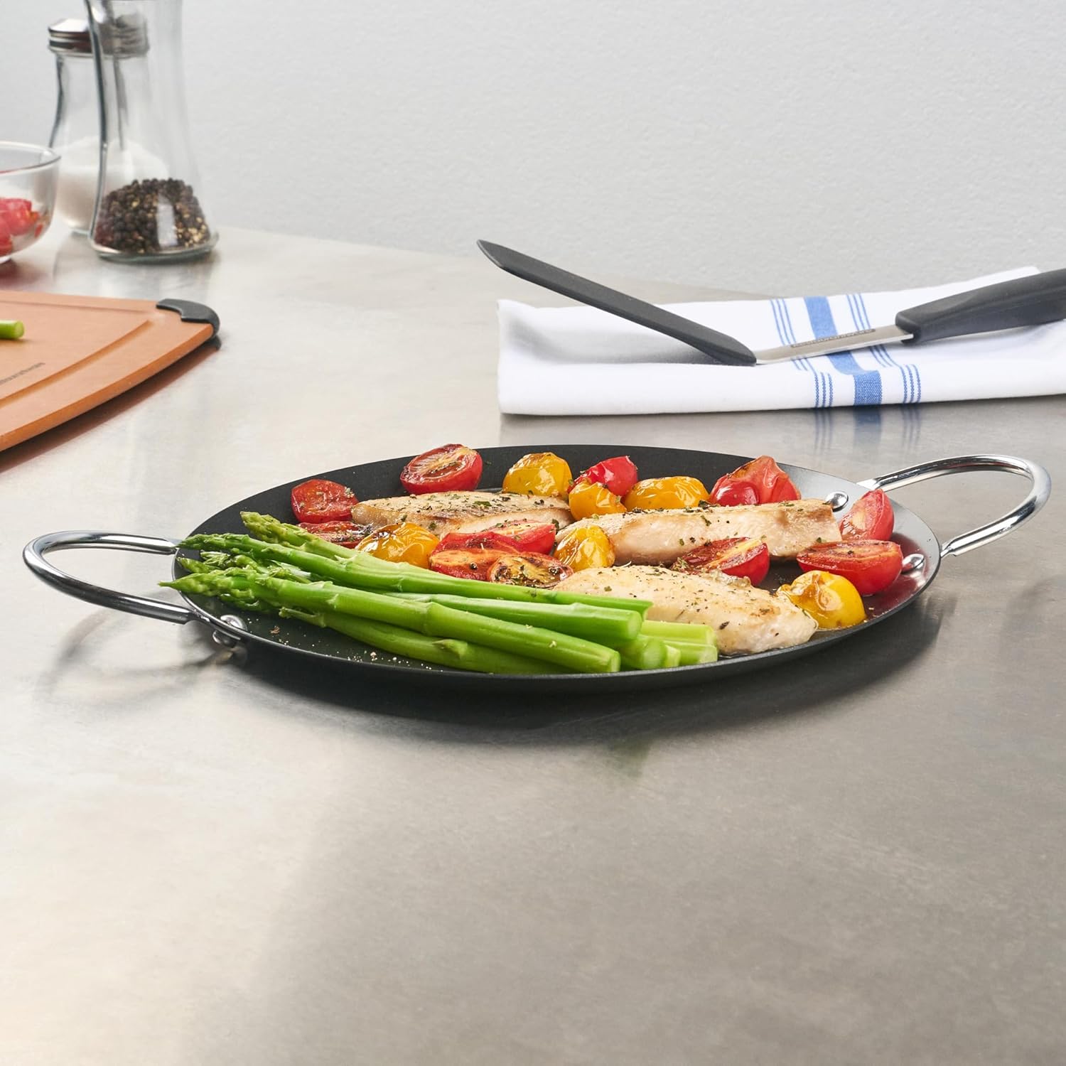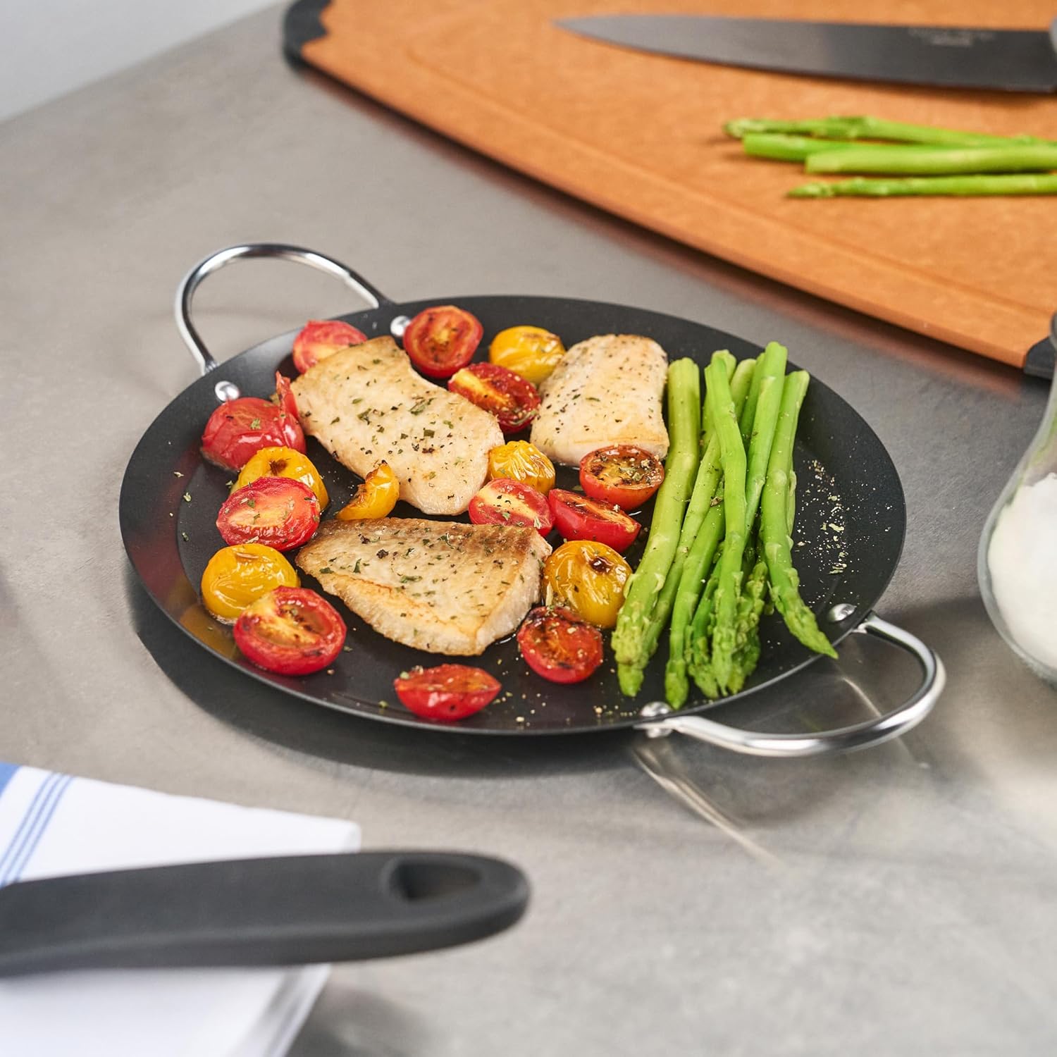 Ensure perfectly cooked meals with the Met Lux Non-Stick Small Round Carbon Steel Comal. This carbon steel comal features a non-stick surface that ensures effortless food release and easy cleanup, allowing you to maintain a pristine kitchen environment. The even heat distribution of this nonstick comal guarantees consistent cooking results, helping chefs and foodservice professionals deliver uniformly cooked dishes every time. Measuring 12.2 inches in length and 8.97 inches in width, this round comal is designed with chrome handles that offer a sturdy grip for safe transport, enhancing operational efficiency in busy kitchens. Invest in this essential cooking tool to streamline your kitchen operations and achieve outstanding culinary results. Each order includes 10 Met Lux Non-Stick Small Round Carbon Steel Comal.
