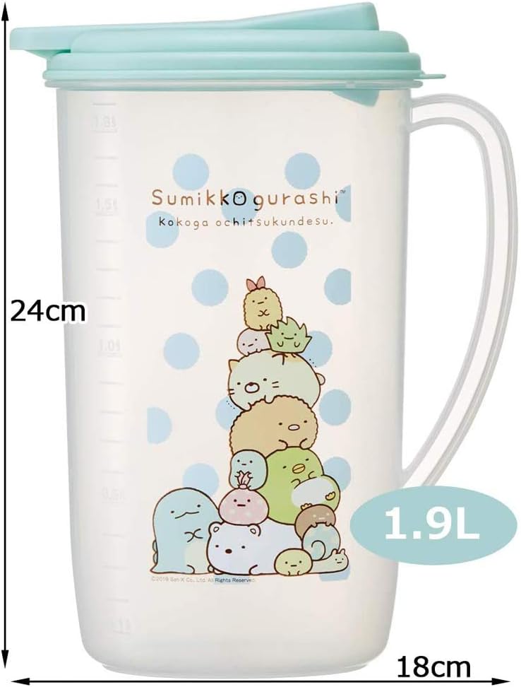 A cold water bottle with cute popular characters. Capacity: 0.4 gal (1.9 L) The wide mouth bottom and sides are easy to clean and clean at all times. (*Not dishwasher safe. ) Simple one-push opening and closing system allows you to press the plug even while holding the handle. The large, sturdy handle makes it easy to hold and pour. Easy to use size with convenient markings to see the remaining charge at a glance. Comes with a handle for easy carrying and pouring.