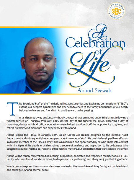 It is with great sadness that the Board and Staff of the TTSEC announce the passing of our dearly beloved colleague, Anand Seewah. Today, we wish to celebrate Anand’s life and his remarkable contributions at the Commission. We also take this time to extend our deepest condolences to all Anand’s family and friends. May he continue to Rest in Eternal Peace.