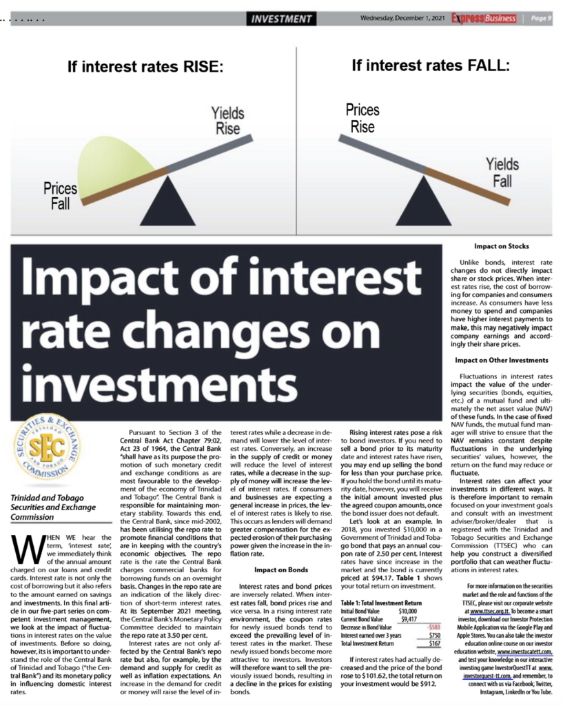 When we hear the term, ‘interest rate’, we immediately think of the annual amount charged on our loans and credit cards. Interest rate is not only the cost of borrowing but it also refers to the amount earned on savings and investments. In this final article in our five-part series on competent investment management, we look at the impact of fluctuations in interest rates on the value of investments. Before so doing, however, its is important to understand the role of the Central Bank of Trinidad and Tobago (“the Central Bank”) and its monetary policy in influencing domestic interest rates.