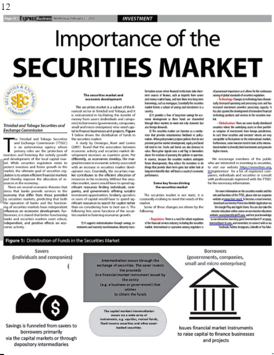 The Trinidad and Tobago Securities and Exchange Commission (“TTSEC”) is an autonomous agency whose primary roles are the protection of investors and fostering the orderly growth and development of the local capital market. While securities regulation exists to protect investors and foster growth in the market, the ultimate goal of securities regulation is to attain efficient financial markets and thereby improve the allocation of resources in the economy.