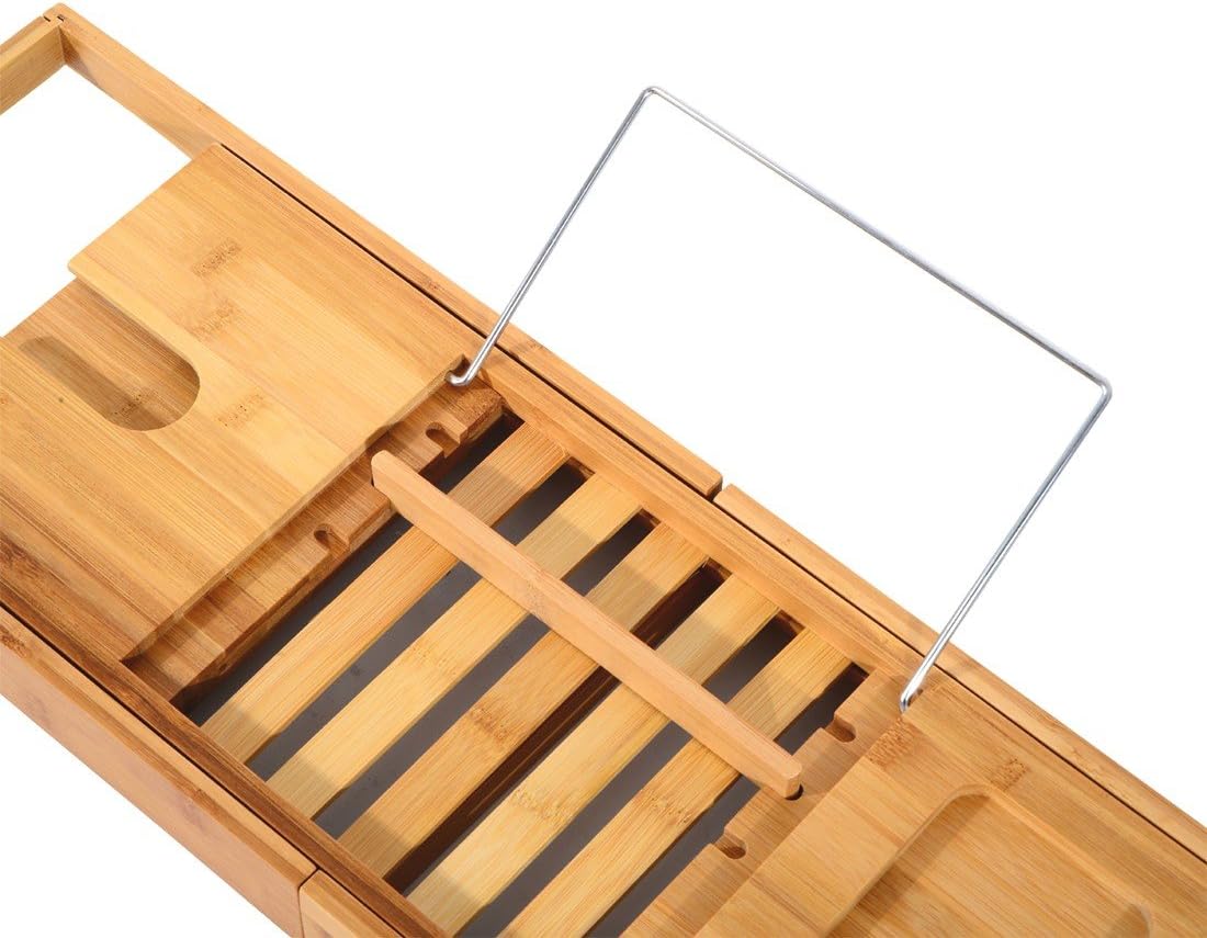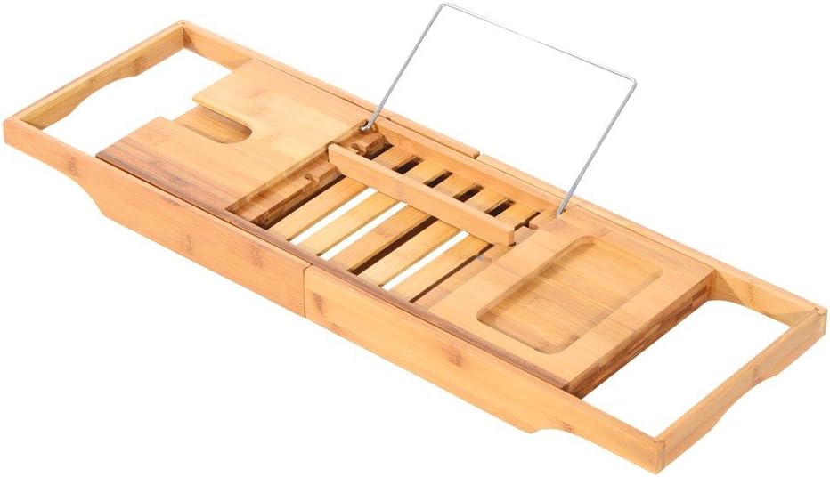 This bathtub rack in original bamboo color is constructed from high quality bamboo and metal supporting frame in excellent craftsmanship for many years use. Its length is adjustable between 70 and 105cm. Supporting rack slope is 3 positions adjustable. When you are bathing, this shelf can be placed on bathtub, you can prepare a book and some food on shelf for easy access. Supporting rack slope is 3 level adjustable Varnish processing on surface Lightweight and easy to operate
