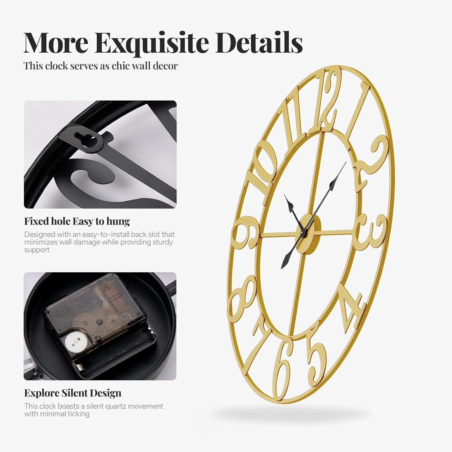 | Additional Features | Battery-Operated, Completely Silent, Cordless, Extra Large Wall Clocks, Non Ticking |