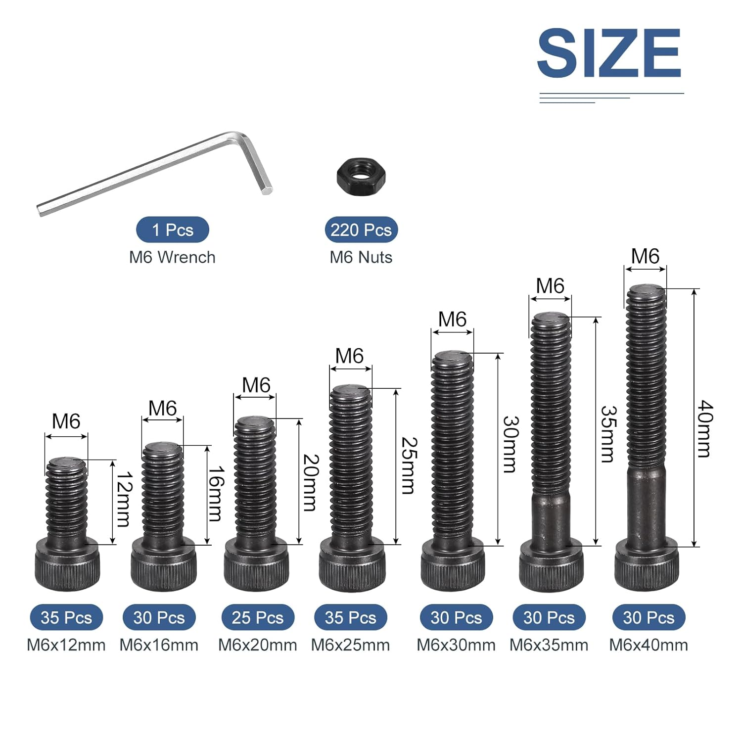 Product Details:Material: 12.9 Grade SteelM6x12/16/20/25/30/35/40mm(D*H) thread sizePackage Content: 436pcs x Hex Socket Head Cap Bolts Screw KitMaterial -The bolt kits are made of 12.9 Grade Steel material, which is corrosion-resistant and rust-resistant, not easy to break, can maintain high strength and excellent performance in harsh environments, and is durable for long-time use.Feature -This bolt kit thread is very smooth, sharp, and accurate. Uniform force, located in the center of the head with no offset, not easy to slipApplication -Widely used in furniture, household items, industry, construction, machines, motorcycles, equipment repair, and other DIY projects. For appliance maintenance and replacement in homes, shops, garages, and other small repair shops to replace damaged and missing screws.Notice -The bolt kits are packed in a durable box, to avoid making a mess, the box is clearly labeled so that you can quickly identify the size you need by the label.