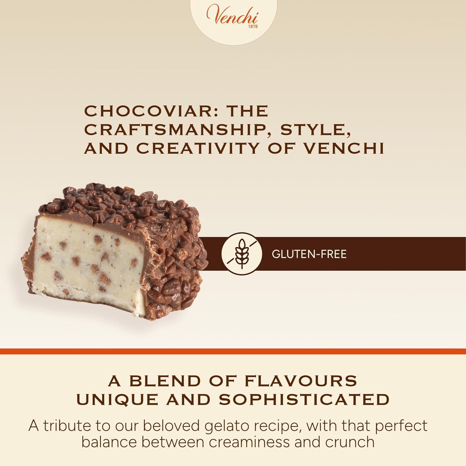 Chocoviar embodies the expertise, style and creativity of Venchi with its unique and sophisticated blend of textures, delightful fillings, crunchiness and taste, all topped off with our chocolate microspheres. In this version, a filling of cream, toasted cocoa nibs and vanilla beans, covered in milk chocolate and decorated with milk Chocoviar sprinkles. A tribute to our beloved gelato recipe, with its perfect harmony of crunchy and creamy, which never goes out of style.