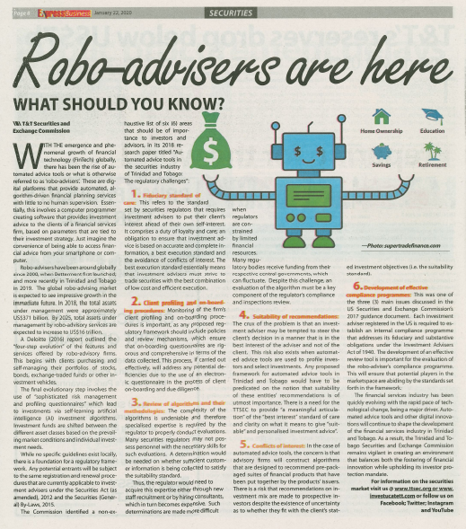 With the emergence and phenomenal growth of financial technology (FinTech) globally, has been the rise of Automated Advice Tools or what is otherwise referred to as ‘Robo-Advisers’.  These are digital platforms that provide automated, algorithm-driven financial planning services with little to no human supervision. Essentially, this involves a computer programmer creating software that provides investment advice to the clients of a financial services firm, based on parameters that are tied to their investment strategy. Just imagine the convenience of being able to access financial advice from your smartphone or computer.