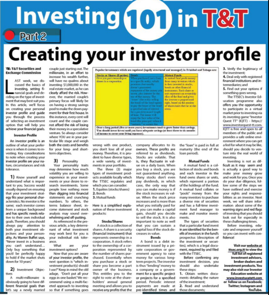 In the past two (2) articles the Trinidad and Tobago Securities and Exchange Commission (“TTSEC”) discussed six (6) of the