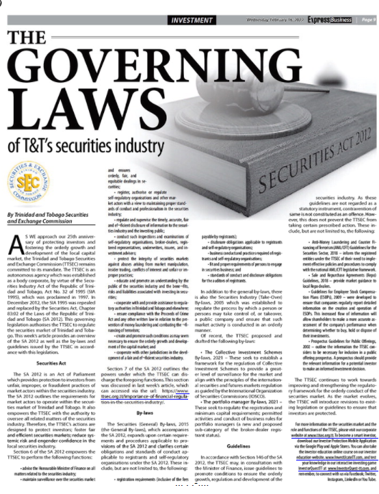 As we approach our 25th anniversary of protecting investors and fostering the orderly growth and development of the local capital market, the Trinidad and Tobago Securities and Exchange Commission (“TTSEC”) remains committed to its mandate. The TTSEC is an autonomous agency which was established as a body corporate, by virtue of the Securities Industry Act of the Republic of Trinidad and Tobago, Act No. 32 of 1995 (“SIA 1995”), which was proclaimed in 1997. In December 2012, the SIA 1995 was repealed and replaced by the Securities Act, Chapter 83:02 of the Laws of the Republic of Trinidad and Tobago (“SA 2012”). This governing legislation authorises the TTSEC to regulate the securities market of Trinidad and Tobago. This week’s article provides an overview of the SA 2012 as well as the By-laws and Guidelines issued by the TTSEC in accordance with this legislation.