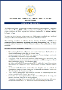 The Trinidad and Tobago Securities and Exchange Commission (“the Commission”) announces that on Monday 8th June, 2020, its Office located at Tower D, Wrightson Road, Port of Spain, will be re-opened to the public. Regular office hours will be maintained i.e. Monday to Friday, 8:00am to 4:00pm.